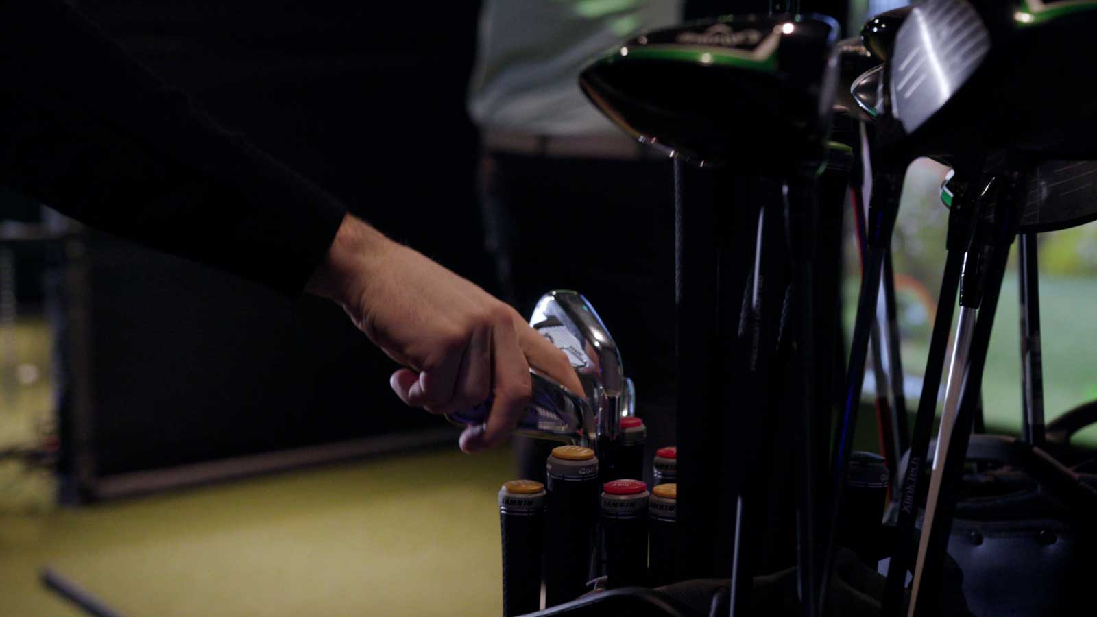 Hand selecting a golf club from a bag inside an indoor golf simulator facility