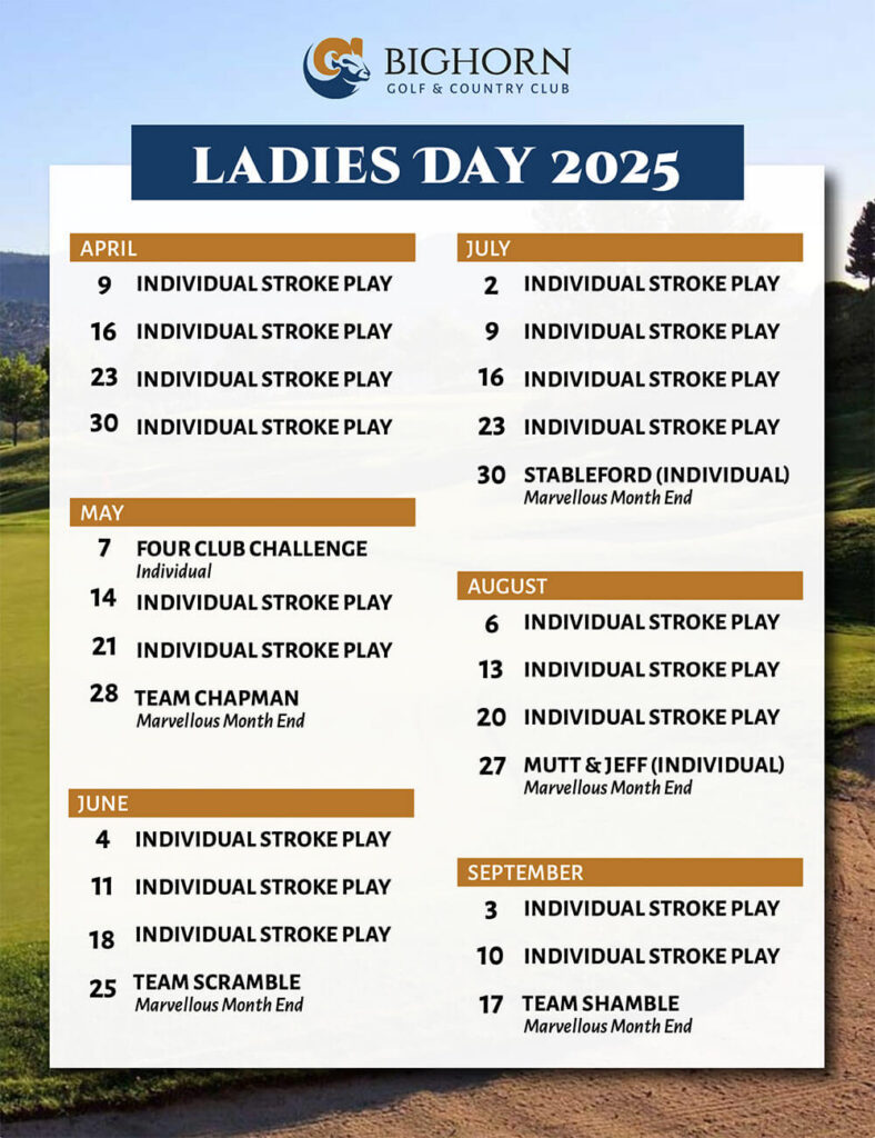 Ladies’ Day starts at 11AM on Wednesdays from early April to late September annually. With payment of an entry fee anyone of any ability with a Golf Canada handicap are encouraged to play. Even without one, you may play, but you will be given a 0 handicap for the competition. Prizes include KP, Long Putt, KP 2nd shot, Closest to the pylon, in the Sand draw, Gross, Net, and Draw. Many of the prizes are flighted. The front nine of your round counts as the competition nine and we alternate starting on 1 and 10 each week to add to the fun and variety. Enjoy a meal and a beverage after in Mason’s while waiting to see if you have won some prizes. Scoring is done on Golf Genius, so you can see live updates. Join us and have some fun on Ladies’ Day at Bighorn.